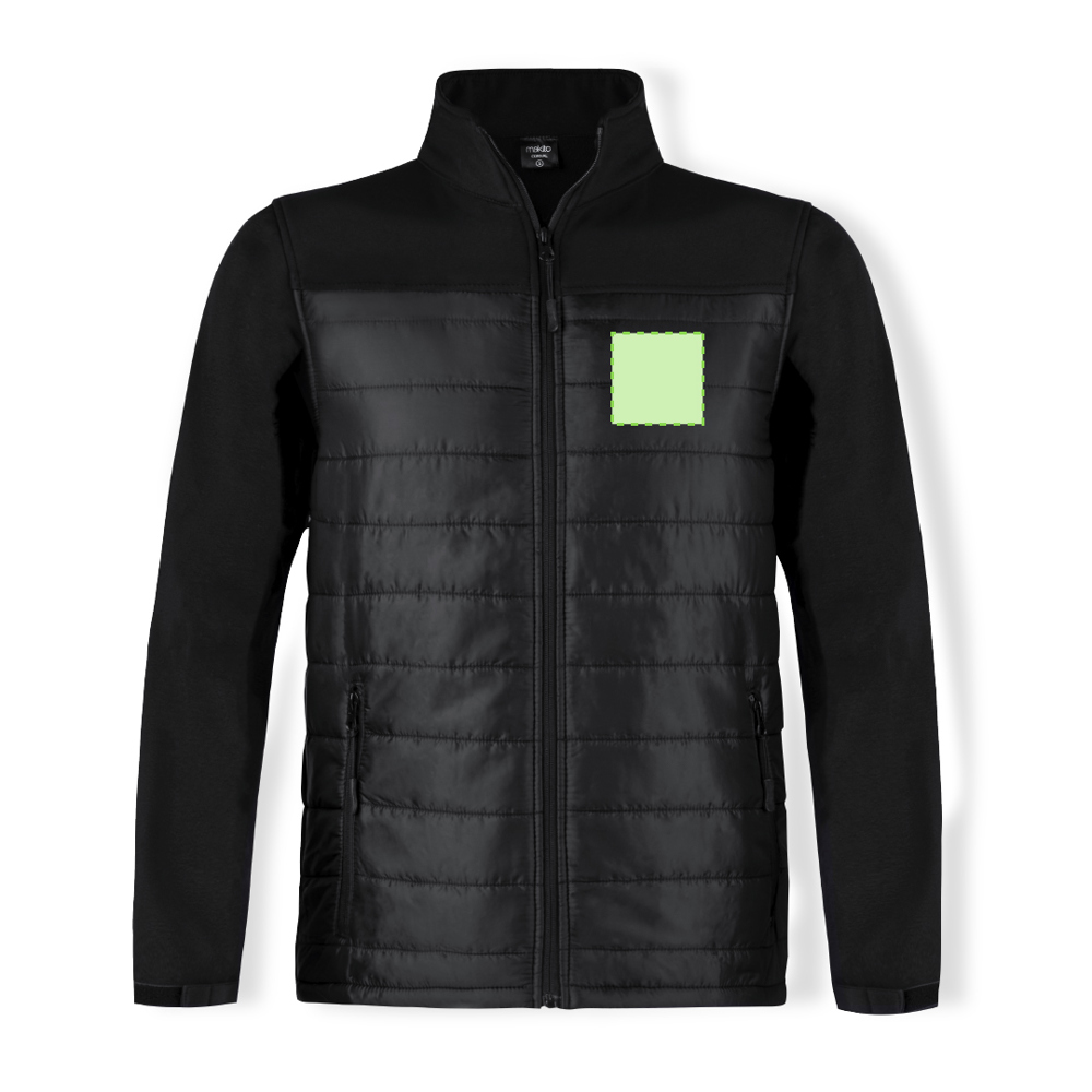 Waterproof and breathable jacket in combination of soft shell and polyester materials. In an elegant black color construction, with zipper closure and side zipper pockets, with pullers for easy opening. Adjustable cuffs and available in sizes S, M, L, XL, XXL.