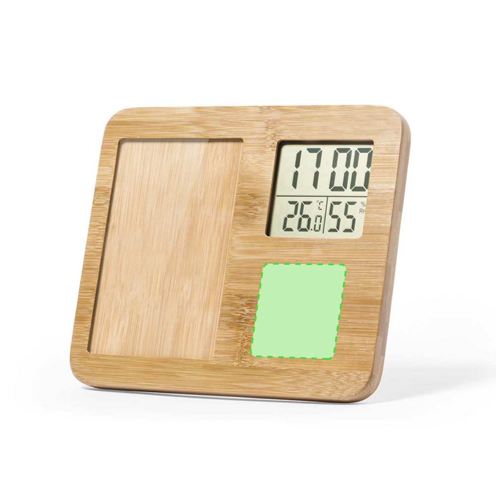 Nature line photo frame made in polished bamboo, with integrated weather station and functions thermometer, hygrometer and clock. Suitable for 9x14cm photos and with battery operated clock (button cells included). Presented in an attractive eco design box. Availan instruction manual in English and Spanish.